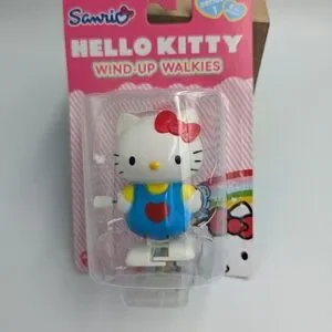 Charming Hello Kitty wind-up toy. Features a red bow and heart. Blue outfit with white accents. Fun and playful design.