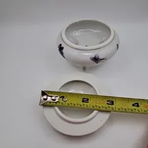 Design: Round, squat body sitting on three ornate flared feet. The pattern includes clusters of violets on the lid and sides, with a surprise single violet blossom inside the bottom of the bowl.