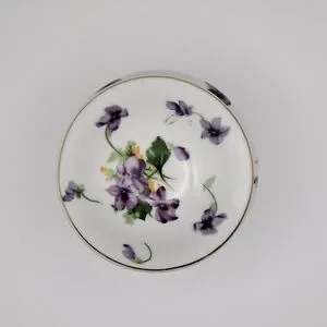 Up for sale is a beautiful Vintage Norcrest Fine China Footed Trinket Box. This elegant piece features a vibrant purple violet pattern on a crisp white porcelain background, accented with delicate gold gilt trim on the rim and feet.