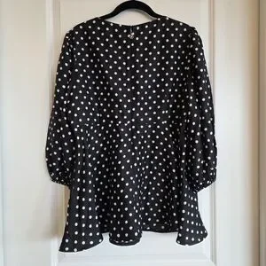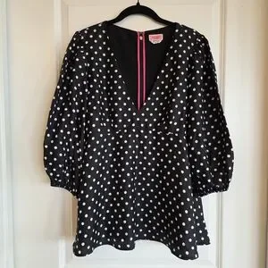 A chic, textured peplum blouse featuring a black and white polka dot pattern, a plunging V-neckline, and 3/4 puff sleeves with elastic cuffs.
