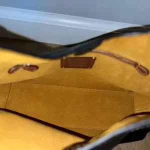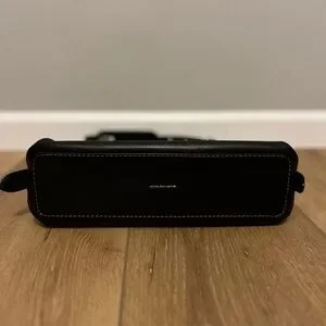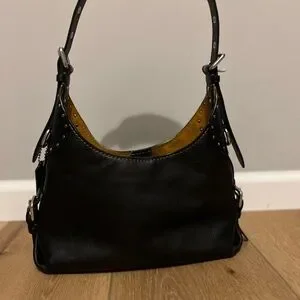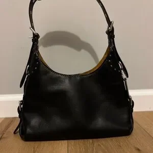 Coach leather cargo shoulder bag. Single top strap with adjustable buckle details. Silver-tone hardware and rivet accents. Curved, structured silhouette for everyday use.