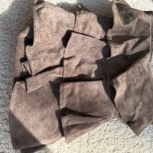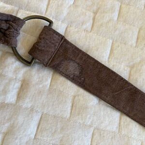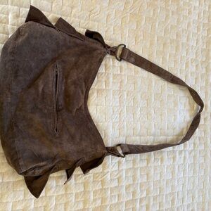 Brown suede shoulder bag with layered ruffle detailing for a feminine look. Soft suede finish and single strap for comfortable wear. Versatile style that pairs well with casual and dressy outfits.