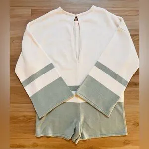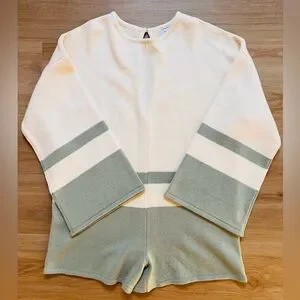 Beautiful SABO Australia knit playsuit romper in a soft cream and sage green colorblock design. This relaxed, cozy piece features a minimalist boho aesthetic with wide bell sleeves and a comfortable oversized fit. Perfect for lounging, vacation, resort wear, or casual chic styling.