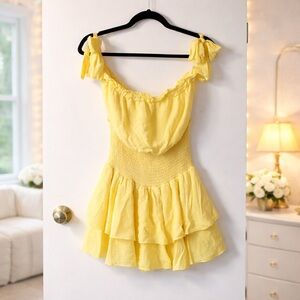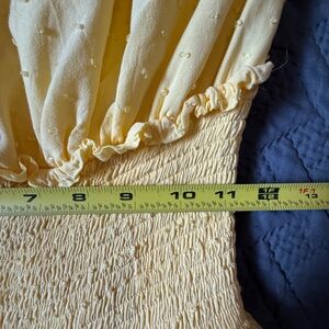 forever 21 romper, forever 21 spring romper, yellow romper, pastel yellow romper, butter yellow romper, swiss dot romper, textured dot romper, tie shoulder romper, bow strap romper, smocked waist romper, ruffle hem romper, tiered romper, flouncy romper, feminine romper, cottagecore romper, coquette romper, babydoll romper, fit and flare romper, lightweight romper, spring outfit, summer outfit, brunch romper, vacation romper, festival romper, cute yellow romper, mini romper, sleeveless romper