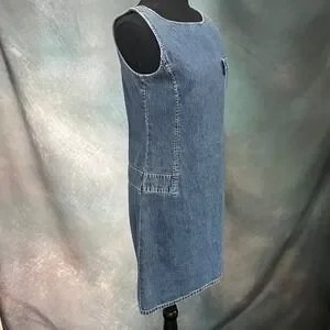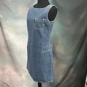Keywords: Vintage, 90s, Y2K, Denim Dress, Shift, Sleeveless, Streetwear, Utility, Minimalist, Indie, Grunge, Casual, Cotton Denim, Medium Wash, Retro