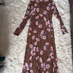 Free People long sleeve maxi with an allover leopard and floral print. Pink blooms scatter across a brown leopard base. High neckline and slim sleeves create a sleek look. Lightweight, flowing fabric for easy wear.