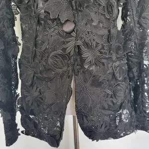 New without tags. Elegant black wide-leg pants with 3D floral lace overlay. Sheer detailing with textured appliqués creates a statement look. Pairs seamlessly with tailored jackets or crop tops for evening and special events.