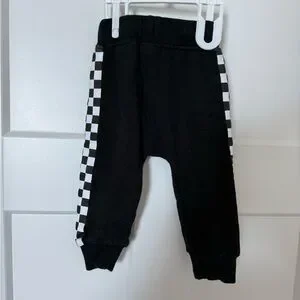 Comfortable black kids joggers with bold black-and-white checker side panels. Elastic ribbed waistband and cuffs provide a secure, flexible fit. White drawstring adds a stylish contrast for easy adjustment. Durable cotton-blend fabric for everyday play and casual wear. Bamboo fabric!