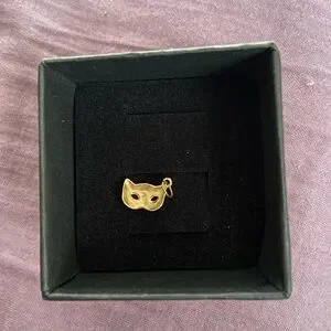 Delicate cat mask pendant in 14k yellow gold. Subtle shine with minimalist sculpted details. Easy to attach to chains or bracelets. Playful and refined accent for daily wear.