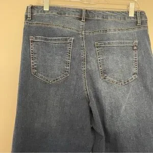 Classic high-rise wide leg jeans by . Dark blue denim with button-front closure and flattering vintage wash. Comfortable fit with a full-length wide leg silhouette. Easy to style for casual or dressed-up looks.
