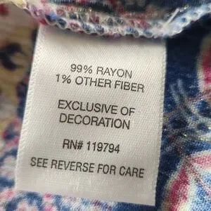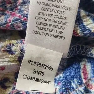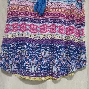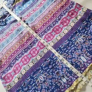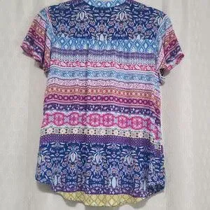 Bohemian style blouse with vibrant patterns. Features a mix of blue, pink, and purple hues. Short flutter sleeves, Three wooden buttons and tasseled ties