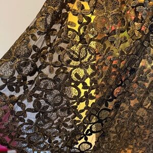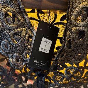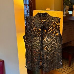 Delicate sleeveless button-down in black and gold. Intricate floral crochet design offers a refined, breathable layer. Lightweight and versatile for dressing up or layering. Tmeless elegance.