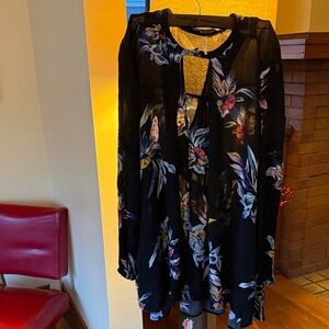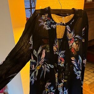 Lightweight fabric with all-over floral print. Keyhole neckline detail. Long sleeves with gentle drape. Feminine, flowy silhouette.