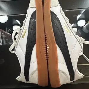 Puma low-top sneakers. White leather and suede upper. Lace-up front with padded tongue. Gum rubber sole for traction. Subtle gold Puma branding on tongue.