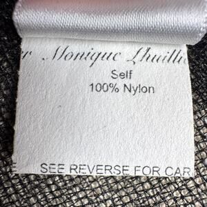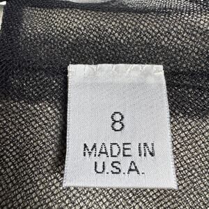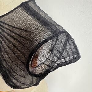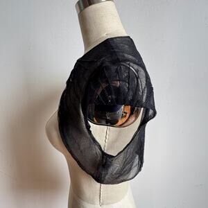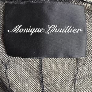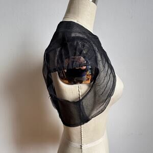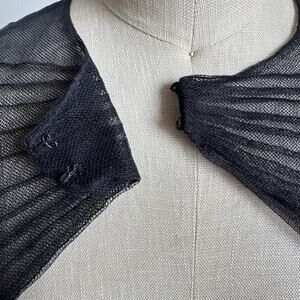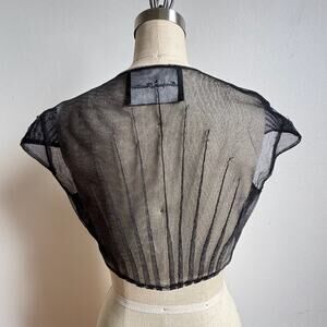 Details: MONIQUE LHUILLIER black sheer micro-mesh bolero/shrug with pleated nylon construction and pleat-tucked cap sleeves. Two hook-and-eye closures at the front. Made in the USA. Minimalist, edgy, feminine piece for formal wear, wedding guest looks, or day-to-night styling.