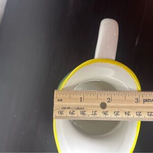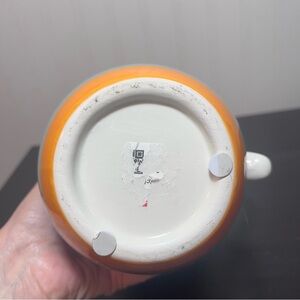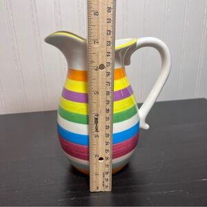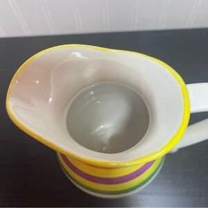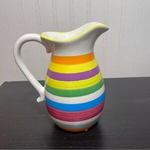 Bright ceramic pitcher with bold horizontal stripes. Features orange, yellow, purple, green, blue, red and white bands. Smooth glazed finish. Classic pitcher shape with a comfortable handle.