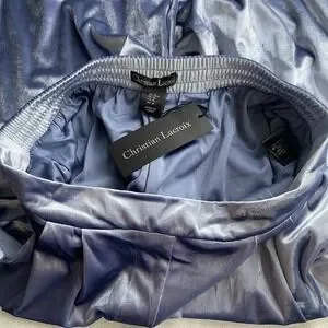 The Christian Lacroix Medium Velour Wide Leg Pleated Pants in Light Blue are a stylish and versatile addition to any wardrobe. Made from a luxurious blend of polyester and spandex, these pants feature an elastic waist for a comfortable and flattering fit. The wide-leg style and pleated front add a touch of elegance, making them perfect for a party, casual outing, or business setting. With a high-rise and relaxed fit, these pants offer both style and comfort for all-day wear.