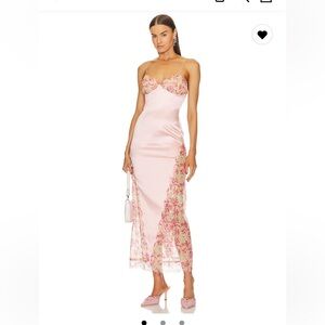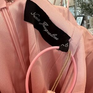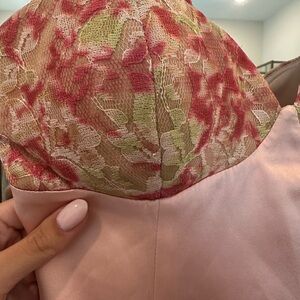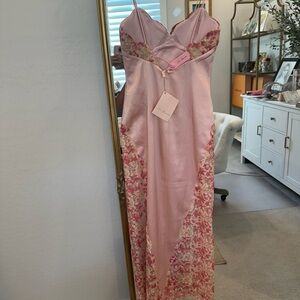 Elegant soft pink slip dress by Nana Jacqueline. Thin spaghetti straps and delicate lace trim. Smooth, flowing fabric with a feminine silhouette.