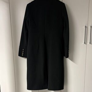 Stay warm and stylish with this elegant dark green double-breasted coat. Brass crested buttons with epaulet detail on shoulders. 19” pit to pit, 43.5” long. Excellent condition.