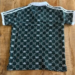 M but fit SMALL . Stylish Gucci polo featuring a green base with white logo design. Perfect for casual wear.