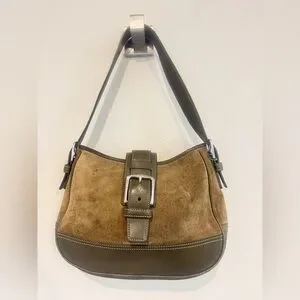 Coach shoulder bag in suede with leather trim. Olive leather strap and buckle accent. Soft brown suede body. Classic, low-profile silhouette.