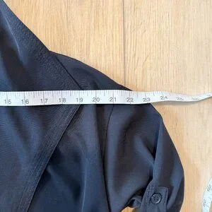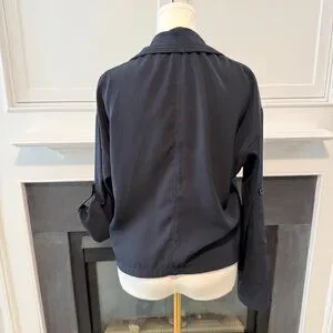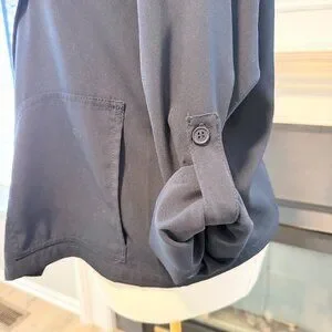 The sleek navy design and lightweight stretch fabric make it perfect for transitional weather, office wear, travel, or everyday layering. The rolled sleeve tabs with button detail allow for adjustable styling and a more relaxed look.