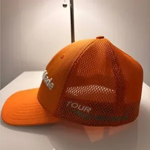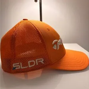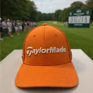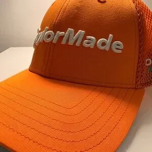 Bold orange TaylorMade cap with white embroidered logo. Classic curved brim and structured front. Lightweight and sporty design.