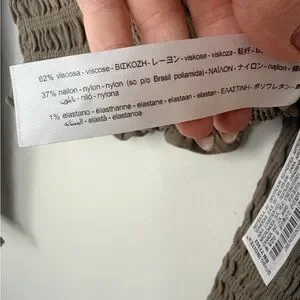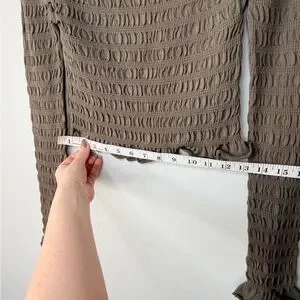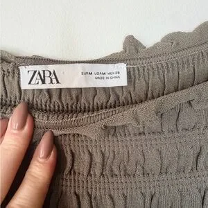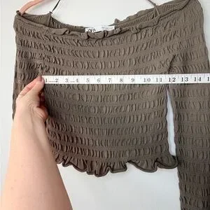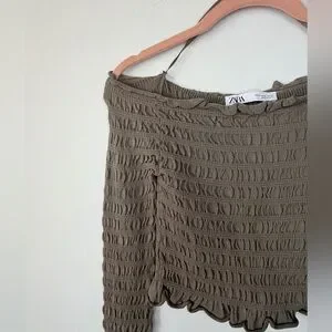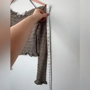 Chic Zara smocked crop top in a beautiful khaki olive green shade. The stretchy smocked fabric creates a flattering, fitted silhouette while the subtle ruffle trim adds a feminine touch.