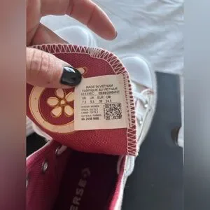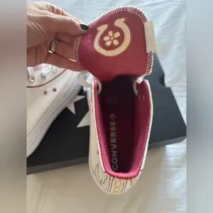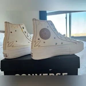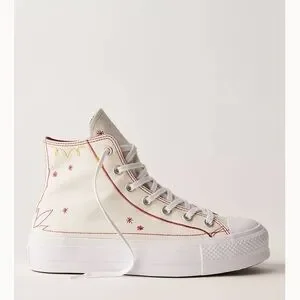 Converse women's high-top platform sneaker in white with red stitch detailing. Signature round logo patch and metal eyelets for classic style. Cushioned platform sole for added height and all-day comfort. Stylish, versatile sneaker perfect for everyday wear. New. Tags. Box. Free People. Sold Out. Western. High Top. Never Worn. Super Cute. Size 7. 5. No Damage. Smoke Free Home.