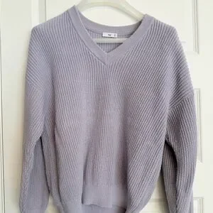 Aritzia TNA V-neck sweater in a soft lavender shade. Chunky textured knit with dropped shoulders. Relaxed fit for easy layering. Classic casual style.