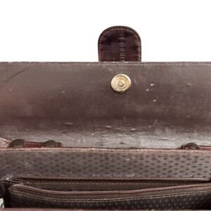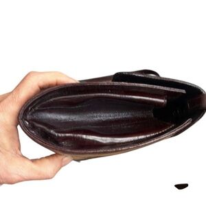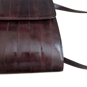 Classic dark brown leather crossbody. Long adjustable strap. Fold-over flap with gold-tone clasp. Structured silhouette and stitched panel detailing. Versatile everyday style.
