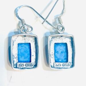 Setting: Each stone is set in sterling silver bezel setting, which is further surrounded by a twisted rope-like border detail. The back of the earrings are marked 925 and c enclosed in a circle and “SE”.