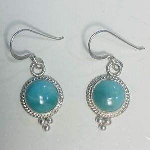 The round earrings are shiny Ocean Blue Larimar. The back of these say Sterling. These greenish turquoise colored dangly earrings look like a shiny marble. They are very smooth to the touch.