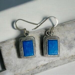 The triangle earrings have vibrant blue gemstones. They are very likely turquoise or a similar blue stone.