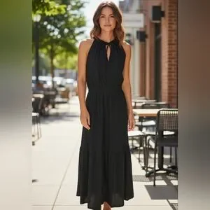 Chic black maxi dress with halter neckline. Ideal for versatile styling.