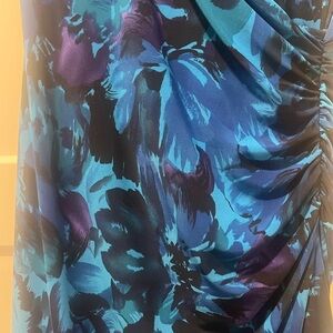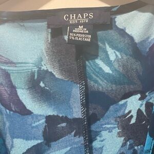 Step into elegance with the Chaps Blue and Black Sheath Midi Dress, perfect for a cocktail night out. This sleeveless dress boasts a chic V-neckline and a wrap-inspired design that enhances the silhouette. The abstract floral print in rich navy and turquoise hues against a black background creates a captivating look. Made from a stretchy fabric, it ensures a comfortable and flattering fit.