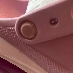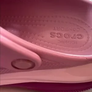 Ombre upper blending pink into lavender. Ventilated Crocs holes on the toe. Pivoting heel strap for stability. Cushioned Croslite foam platform sole. Easy slip-on design for everyday wear.