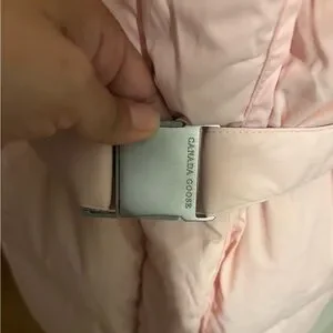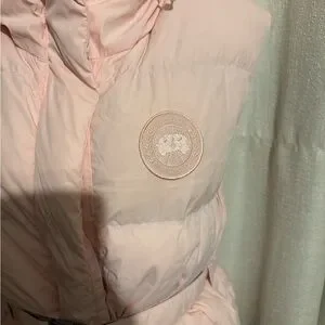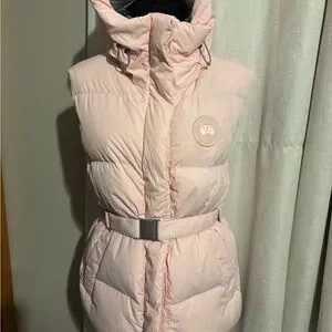 Elegant light pink vest with a belted waist. Features a high collar for added warmth. Ideal for layering in cooler weather.