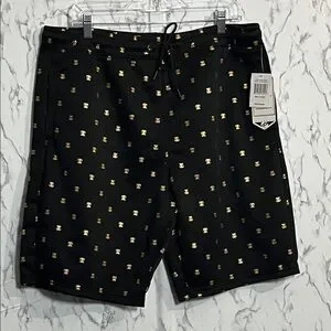 Black swim board shorts with a gold repeating motif. Elastic waistband with drawstring for a secure fit. Quick-dry fabric for comfortable wear in and out of the water. Sleek, modern styling ideal for beach and pool days.