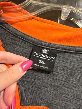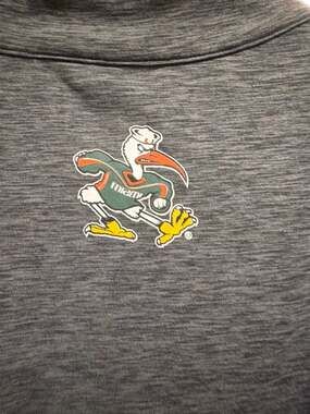Men's Miami Hurricanes Colosseum Quarter-Zip Pullover in a Size 3XL. This athletic top features a heathered charcoal grey body with vibrant orange contrast panels and collar lining. The front showcases the iconic Miami 'U' logo, while the back features a detailed Sebastian the Ibis graphic below the collar. Made from a comfortable blend of 89% polyester and 11% spandex, offering great stretch for game day or workouts. In excellent pre-owned condition with no visible stains, holes, or cracking on the graphics.