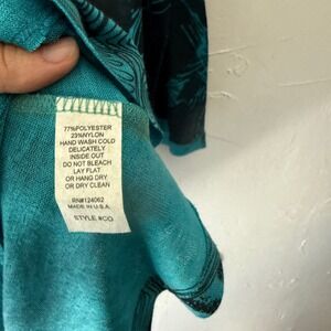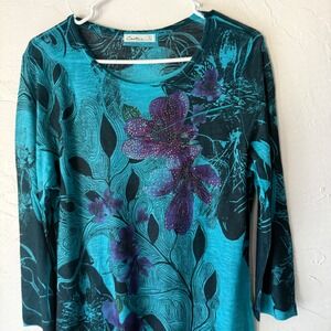 Cactus Teal Floral Rhinestone Detail Long Sleeve Asymmetrical Top Boho Artsy L