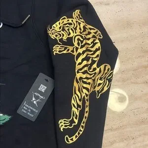 Black zip-front hoodie featuring a bold tiger and rose graphic on the front and a yellow tiger motif on the sleeve. Soft, comfortable fabric with a hood and full zipper. Stylish black hoodie perfect for casual wear and statement outfits.