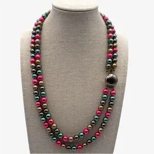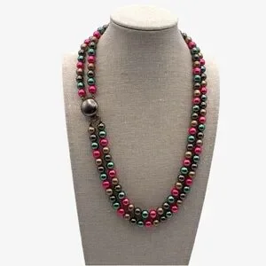 Double strand necklace with great metallic colors of bright pink, vibrant green, silver gray, and champagne gold.
