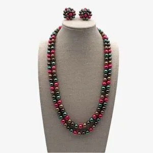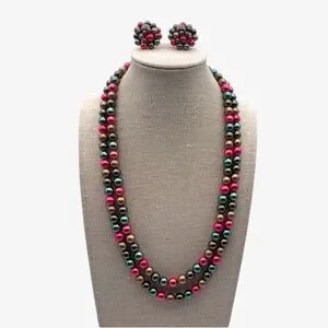 Vintage Double Strand Multi Color Metallic Pearl Necklace & Clip On Earring Set