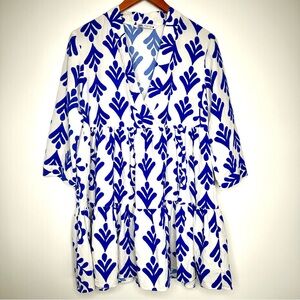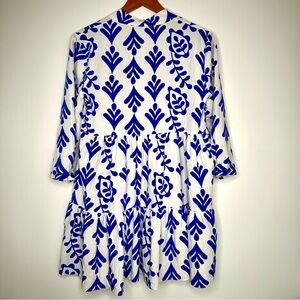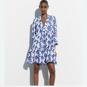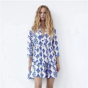 Zara adorable mini dress with floral blue patterns. Features a loose fit and three-quarter sleeves. Ideal for casual wear. Preowned in excellent condition.