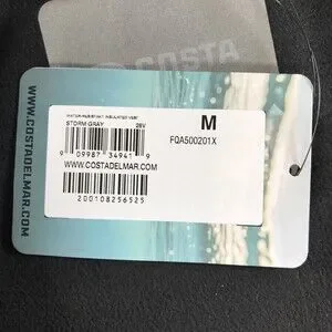 Hangtag information: Costa branding card with water graphic and wording about designs inspired by those who spend their time on the water; secondary tag lists Water-Resistant Insulated Vest name, Storm Gray color designation 28V, size M, style code FQA500201X, CostaDelMar website URL, and barcodes.