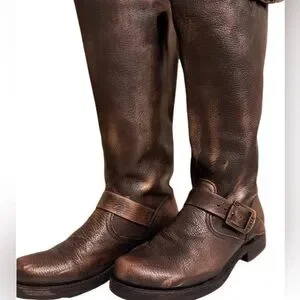 Frye Women’s Veronica Slouch Metallic Bronze Leather Mid-Calf Moto Boots, size 6.5, in excellent condition. Made from washed oiled leather with a soft, relaxed slouch fit. Features a pull-on style, adjustable buckle straps, round toe, and 1” raw stacked heel. Full leather lining and leather sole with rubber tread inset. The metallic bronze finish and hand-antiqued acetone wash create a signature worn-in Frye look. Great for anyone looking for Frye Veronica boots, metallic moto boots, or slouch mid-calf leather boots.