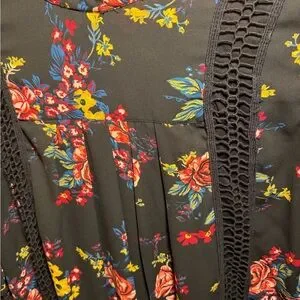 This black blouse features a vibrant floral pattern with red and yellow accents. The intricate crochet details add a touch of elegance, making it perfect for any occasion. Measures 20 inches in width.