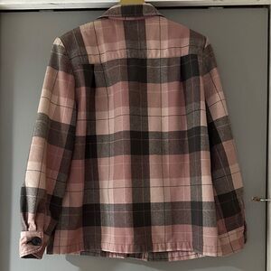 Timeless vintage Pendleton 49er wool jacket featuring a beautiful pink and brown plaid pattern. Known for its iconic design and durable wool construction, the Pendleton 49er jacket offers classic style with a flattering structured silhouette.
