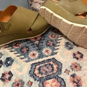 Step out in style with these chic Kork Ease olive green sandals with a beautiful cross over design, heel straps, and a contrasting white sole. Perfect for any occasion, these shoes offer both comfort and elegance.